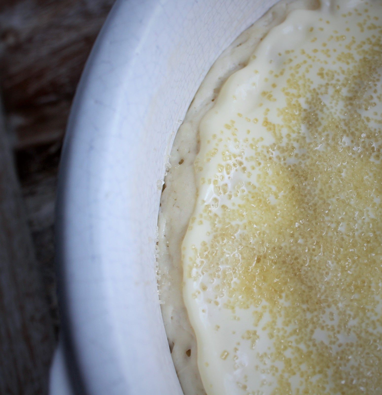 Versez la préparation dans la farine avec le sel et les 10 cl de lait tiède. Pétrissez jusqu'à obtenir une pâte molle et lisse. Placez-la dans votre moule bien graissé de beurre et aplatissez-la. Couvrez d'un linge et laissez lever environ 1h30. La pâte double de volume. Faites des cavités (les fameux "puits d'amour"!) sur l'ensemble de la pâte avec le bout de vos doigts et déposez-y de toutes petites parcelles de beurre. Battez la crème (ou le mascarpone) avec le jaune d'oeuf et enduisez la pâte de la moitié de la préparation. Saupoudrez d'une belle cuillère à soupe de sucre et enfournez pour 10 minutes environ. Ressortez le gâteau, répartissez la crème restante et saupoudrez d'une autre cuillère à soupe de sucre. Enfournez de nouveau pour 10 minutes environ en surveillant la coloration.