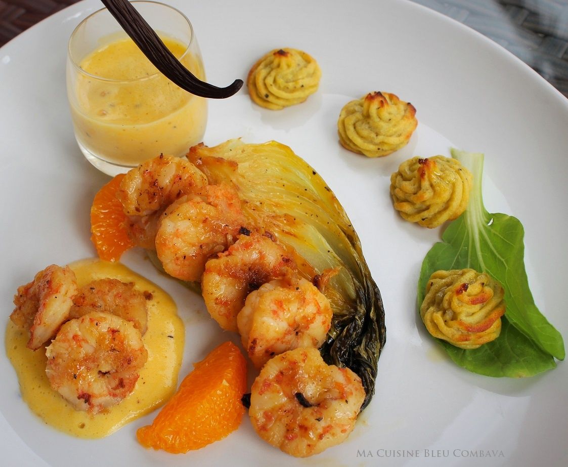 Camarons Marinés et son Sabayon Rhum, Vanille Bleue-Tangor(orange) sur son Lit de Bok Choy Braisé