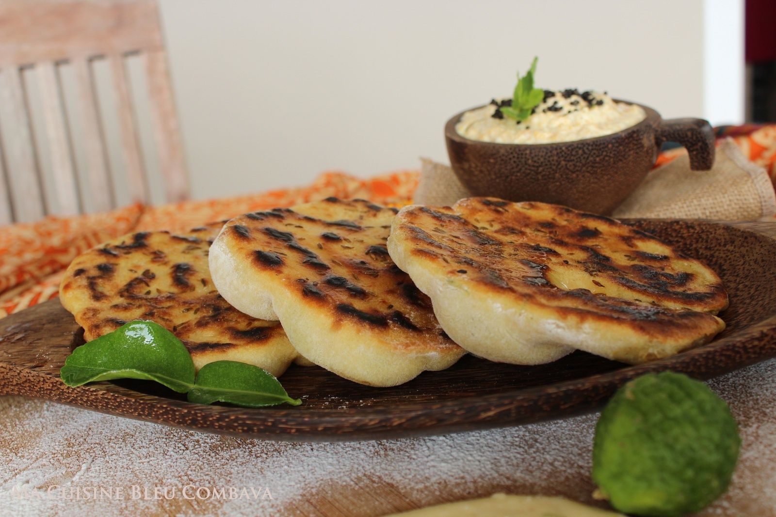 Donc, mon idée de départ se situait dans les balkans mais franchement, y associer le combava était périlleux! Je suis vite revenue vers l'Océan Indien pour trouver mon inspiration dans la multitude de pains indiens: naans, chapati, parathan, poori, bati, dosai, kulchas...Ils sont souvent de forme ronde et plutôt plats. Ils changent de nom, de forme, de préparation ou d'ingrédients en fonction des régions. Ils peuvent se réaliser avec ou sans levains, être natures, assaisonnés ou même farcis. Ils se réalisent dans un tandoor (four indien) ou avec une tawa (sorte de poêle). J'ai trouvé sur ce site indien merveilleux une foule d'informations et de plats succulents dont je m'inspire depuis quelques mois. Jopreets kitchen.